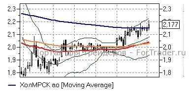 Холдинг МРСК (+1,21%) – акции сегодня поднялись выше последнего важного сопротивления дневного графика в виде линии EMA200 дневного графика (2,15 руб), способность удержать которую будет говорить о хороших перспективах развития роста как минимум в район 2,315 руб. Технические индикаторы указывают на весьма сдержанные силы «быков», близость бумаг к зоне перекупленности и возможность разворота настроений, однако, до пробития отметки 2,15 руб «длинные» позиции стоит сохранять.