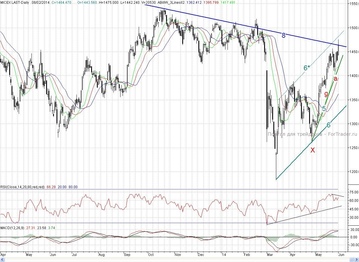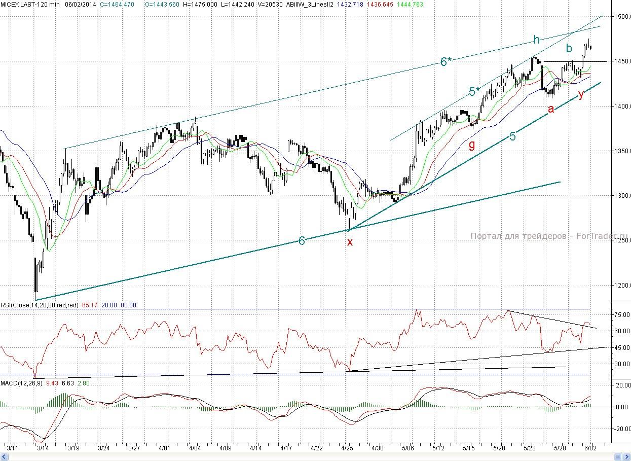 Исследуя 2-часовой график индекса ММВБ, видим, что открывшись с гэпом вверх котировки довольно быстро преодолели пятничный максимум b (1 450,76 п.) и продолжили рост. В районе более сильного медвежьего редута в лице майского максимума h (1 456,66 п.) и трехлетнего падающего тренда (8) быки сделали небольшой перекур, а ближе к обеду уверенно взяли и эти барьеры. После этого рост продолжился, и котировки лишь немного не дошли до верхней границы среднесрочного растущего канала (6-6*). Ближе к закрытию прошла небольшая фиксация прибыли, тем не менее, день завершился в отличном плюсе (2,27%)