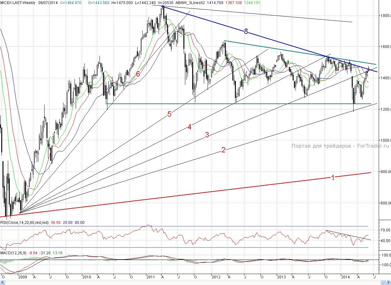 Интересно рассмотреть недельный график индекса ММВБ, на котором видно, что с начала 2009 года растущие тренды (6,5,4) после их преодоления вниз, затем выступали в роли сопротивлений. Пока быки вернули себе тренд (3), но и здесь важно, каким будет закрытие по итогам недели.