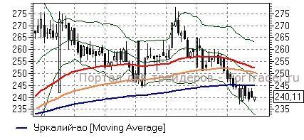Уралкалий (+0,02%) – акции уже не первый день подряд консолидируются у поддержки 239,4 руб, которая пока сдерживает их от дальнейшего снижения. Показания дневного графика при этом предупреждают об актуальности основного нисходящего движения и опасности возобновления падения при закреплении ниже поддержки. Ближайшей целью бумаг в этом случае станет нижняя полоса Боллинжера (232 руб). Пока же котировки остаются выше 239,4 руб можно ожидать дальнейших попыток «быков» поднять их к линии EMA200 (244,8 руб) и при её преодолении в район 248-252 руб.