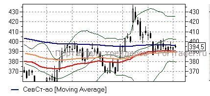 Северсталь (+0,36%) – торговля акциями в последние дни проходит между «долгими» скользящими средними дневного графика (389-396 руб), которые, с одной стороны, удерживают бумаги от более значительного падения, однако, и не дают им подняться выше. Пока котировки удерживают уровень 389 руб у «быков» в случае улучшения внешнего фона есть шансы увидеть движение к отметке 402 руб (средняя полоса Боллинжера), однако, в обратном случае целью бумаг станет значение 379 руб (нижняя полоса Боллинжера).