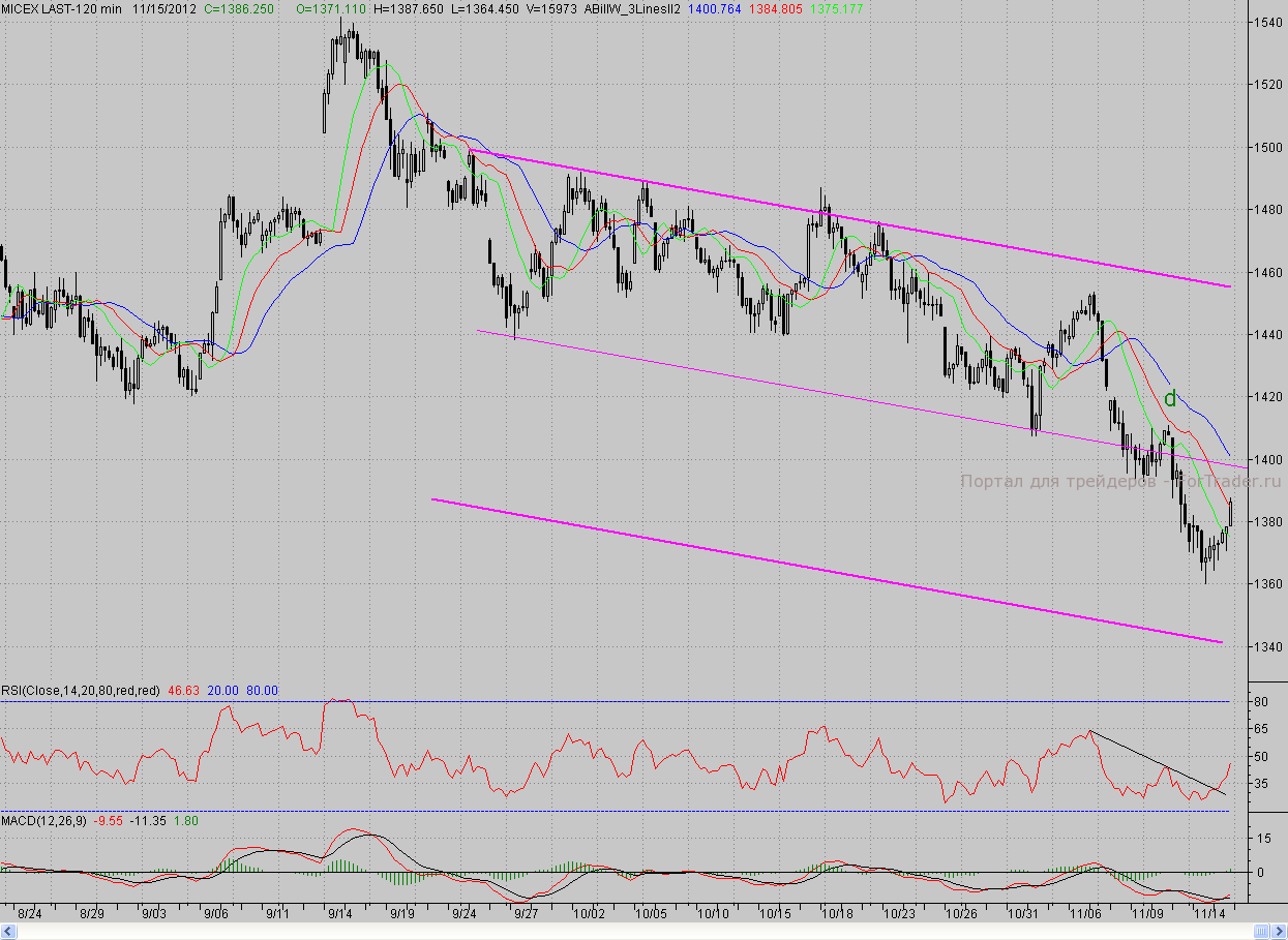 Исследуя 2-часовой график индекса ММВБ, видим, что на негативном внешнем фоне котировки открылись с гэпом вниз. Однако рынок, видимо, уже подустал падать, и на этом гэпе весь негатив и закончился. Правда, и покупать у игроков сильного желания не было, и котировки большую часть сессии торговались на уровне утреннего окна и максимума среды. И лишь под занавес «быки» набрались смелости и пошли в более уверенную контратаку, закрыв день почти на максимуме.