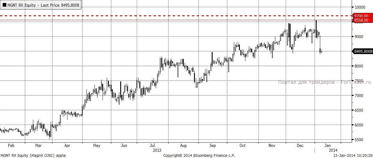 После публикации пресс-релиза, акции Магнита ушли в крутое пике. Вопреки нашему октябрьскому прогнозу акции чуть-чуть не дотянули до уровня 9 700 руб. Максимум оказался на уровне 9 558 руб. После публикации финансового отчёта стоит ожидать повышенной волатильности и продолжения коррекционного движения к уровню 8 000 руб.