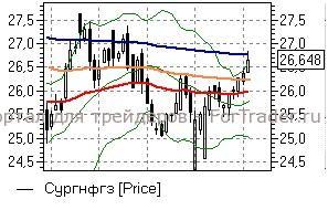 Сургутнефтегаз ао (+1,16%) – акции сегодня тестируют на прочность последнюю важную линию дневного графика – EMA200 (26,75 руб) при умеренно положительных сигналах и близости к зоне перекупленности, что предупреждает «быков» о необходимости соблюдать осторожность. До закрепления выше указанной отметки лучше воздержаться от открытия новых «длинных» позиций – бумаги вполне могут скорректироваться в район остальных «долгих» скользящих средних и средней полосы Боллинжера (25,8-26,25 руб).