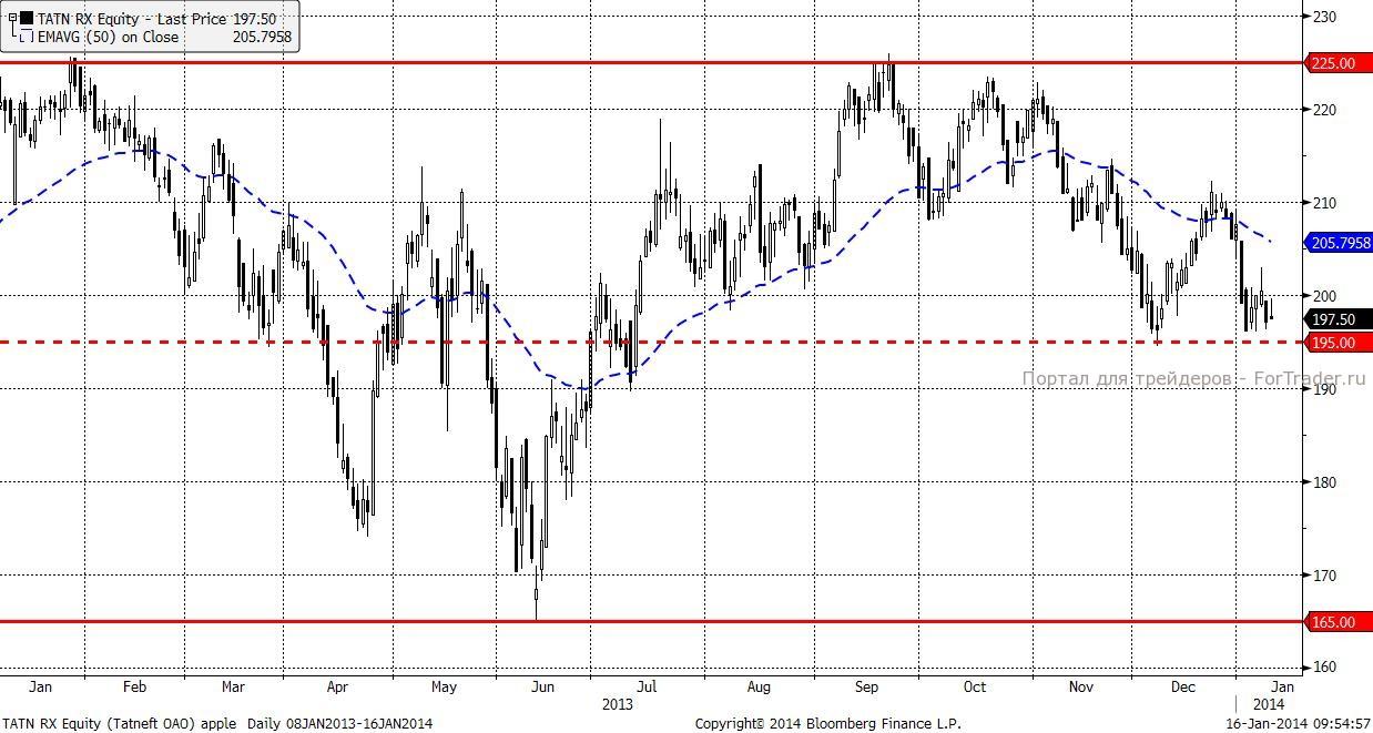 На фоне снижения цены на нефть марки Brent, вероятность того, что акции компании «Татнефть» пробьют уровень 195 вниз, возрастает. Это последний рубеж перед отвесным падением к нижней границе широкого диапазона 195 – 225 руб. за акцию.