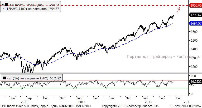 Выступление Джанет Йеллен, произвело приятное впечатление на инвесторов. По ее словам она намерена продолжать программу стимулирования экономики до тех пор пока рынок труда не восстановится. Рынок отреагировал ростом основного индекса США S&P 500, который прибавил около 0,5% и почти достиг нашей цели 1800 п. Мы верим в то что рынок вскоре перейдет в состояние предновогоднего ралли и повышаем цель до 1900 к концу года.