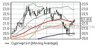 Сургутнефтегаз ап (+0,18%) – акции по итогам вчерашнего дня закрепились выше последних важных линий дневного графика в виде средней полосы Боллинжера и EMA55 (21,7 руб), что указывает на хорошие шансы «быков» увести бумаги в район верхней полосы Боллинжера (23 руб). Технические индикаторы в целом не противоречат развитию подобного сценария, но предупреждают, что силы игроков на повышение пока ещё весьма ограничены – неспособность устоять выше важных поддержек говорила бы об опасности возвращения к снижению.