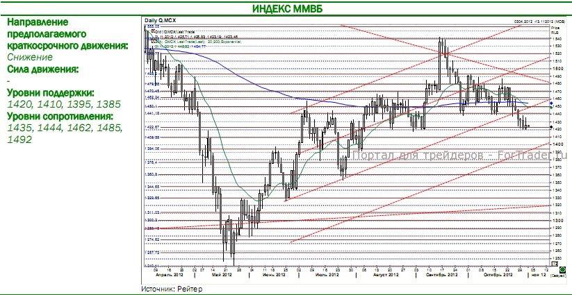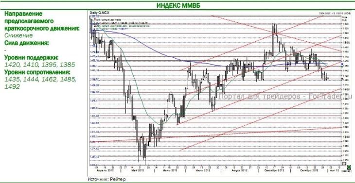 В среду  рынок  акций  открылся  вблизи нижней границы среднесрочного восходящего канала и в течение дня реализовал положительный отскок, вернувшись в диапазон 1430-1435 ММВБ. Основными причинами для повышения оптимизма инвесторов  стали сообщения об отсутствии существенных разрушений после  урагана Сэнди (в первую очередь ключевых объектов инфраструктуры — АЭС и НПЗ), а также позитивный блок статданных по Европе (темпы розничных продаж в Германии превысили прогнозы) и выход фьючерсов на S&P500 в положительную зону – впервые с начала текущей недели. На этом фоне индексы завершили сессию в «плюсе» (ММВБ: +0,3%; РТС: +0,3%), хотя  закрытие  сессии  и  было  несколько  «подпорчено»  данными  по  PMI  Чикаго,  которые  указали  на  спад  деловой активности в регионе (49.9). Торговая активность на рынке акций продолжает находиться на среднем уровне.