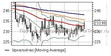 Уралкалий (+1,16%) – акции уже не первый день подряд консолидируются в районе линии EMA55 дневного графика (232,8 руб), не решаясь закрепиться выше. Однако даже в этом случае восходящее движение бумаг пока ограничивают остальные «долгие» скользящие средние (235,7-238 руб). Ранее закрепления выше указанного диапазона не стоит делать ставку на уверенный рост – силы «быков» ещё весьма невелики.