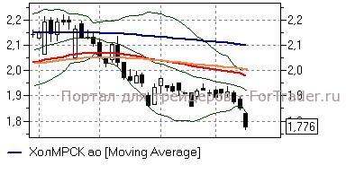 Холдинг МРСК (-3,94%) – акции на прошлой неделе обновили годовые минимумы и сегодня продолжают нисходящее движение, при этом располагаясь вплотную к зоне перепроданности. Технические индикаторы в целом не препятствуют развитию падения, но его стремительность также вполне может спровоцировать краткосрочный отскок от достигнутых значений, о возможности чего предупредила бы способность устоять выше ближайшей поддержки 1,780 руб. В целом преимущество на рынке остается за «медведями», а «быки» в случае улучшения настроений за рубежом могут пока рассчитывать на отскок максимум в район 1,92 руб (средняя полоса Боллинжера).