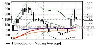 Полюс Золото (-0,18%) – акции сегодня опускались в район средней полосы Боллинжера и «долгих» скользящих средних дневного графика (1075-1080 руб), от которых совершили отскок. Технические индикаторы дают преимущественно положительные сигналы, указывая на неплохие шансы бумаг развить восходящее движение. «Длинные» позиции стоит сохранять пока акции остаются выше 1075 руб, однако, пробой данной отметки говорил бы об опасности «просадки» в район 690 руб (нижняя полоса Боллинжера).
