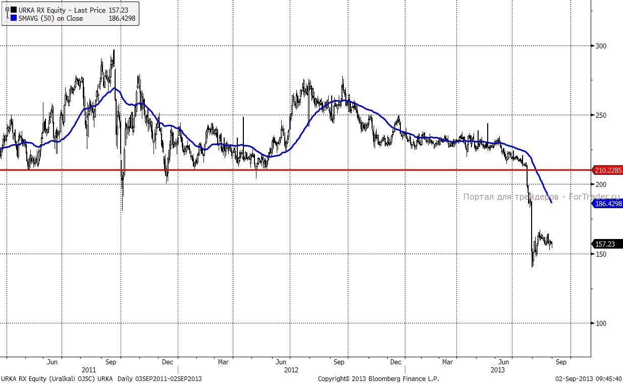 Уралкалий, после существенного падения, достиг уровня поддержки, на котором продолжает оставаться. С точки зрения технического анализа, “бычьих” сил пока маловато для того чтобы развернуть цену, следовательно следует ждать продолжения падения. Ближайший уровень расположен на отметке 100 руб. за акцию.