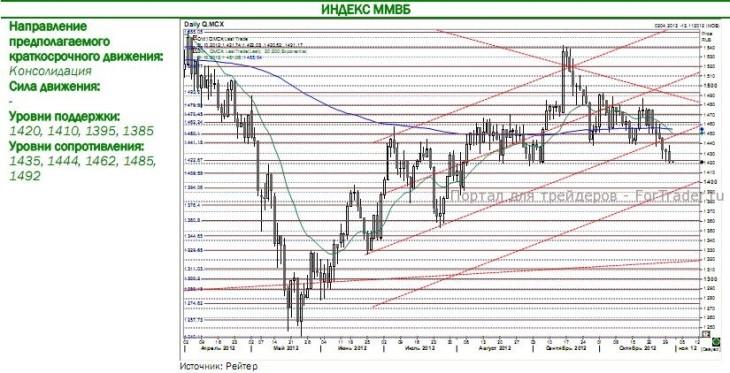 Во вторник российский рынок акций не смог удержаться у уровней закрытия предыдущего дня и снизился к уровням поддержки среднесрочного тренда от середины июня (1420-1425 ММВБ), несмотря на улучшение конъюнктуры внешних рынков, связанное с относительно благополучным прохождением урагана Сэнди по штату Нью-Йорка и надеждами инвесторов на открытие американских бирж в среду. На динамику российского рынка оказало сильное негативное влияние решение Газпрома (-2,5%) заметно увеличить инвестпрограмму на 2012 год. Торговая активность на рынке вернулась к среднему уровню. По итогам дня индекс ММВБ потерял 0,7%.