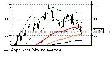 Сбербанк ап (-0,23%) – акции вчера не удержались выше 74 руб (линия EMA55) и, таким образом, рискуют продолжить снижение как минимум в район EMA100 (72,25 руб), об опасности чего нами предупреждалось ранее. Рассчитывать на коррекционный отскок в район 74-74,35 руб (также средняя полоса Боллинжера) стоит не ранее появления значимых фундаментальных сигналов из-за рубежа.