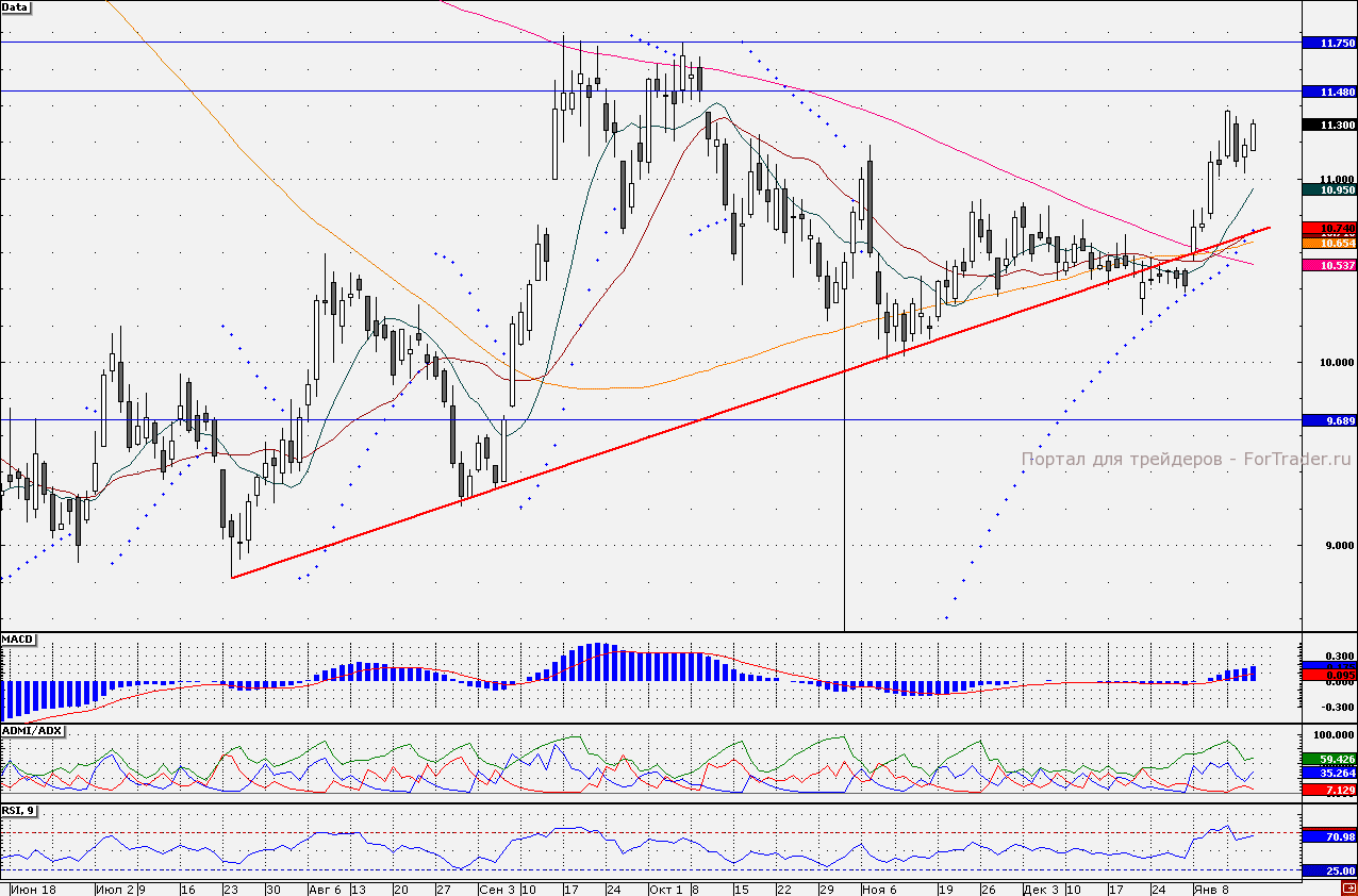 Позитивную динамику в первой половине сессии демонстрируют акции ММК. Бумаги еще не реализовали «бычью» цель на уровне 11,48 руб., где находится незакрытый гэп от 10 октября прошлого года. Техническая картина по бумагам по-прежнему позитивна. График индикатора MACD(12;26;9) растет на положительной территории. Индикатор ADMI/ADX показывает, что силы «быков» по бумагам преобладают (линия «быков» находится выше линии «медведей»), при этом график индикатора Parabolic SAR находится ниже графика акций. Таким образом, показания индикаторов не исключают вероятности продолжения восходящего движения акций. После того, как ближайшая цель будет реализована, следующим сопротивлением выступит район 11,75 руб. Однако бумаги по-прежнему сильно перекуплены, в связи с чем от отметки 11,48 руб. прибыль по спекулятивным «лонгам» стоит частично фиксировать. Наш 30-минутный торговый робот находится в «лонгах», удерживая длинные позиции от отметки 11,26 руб.