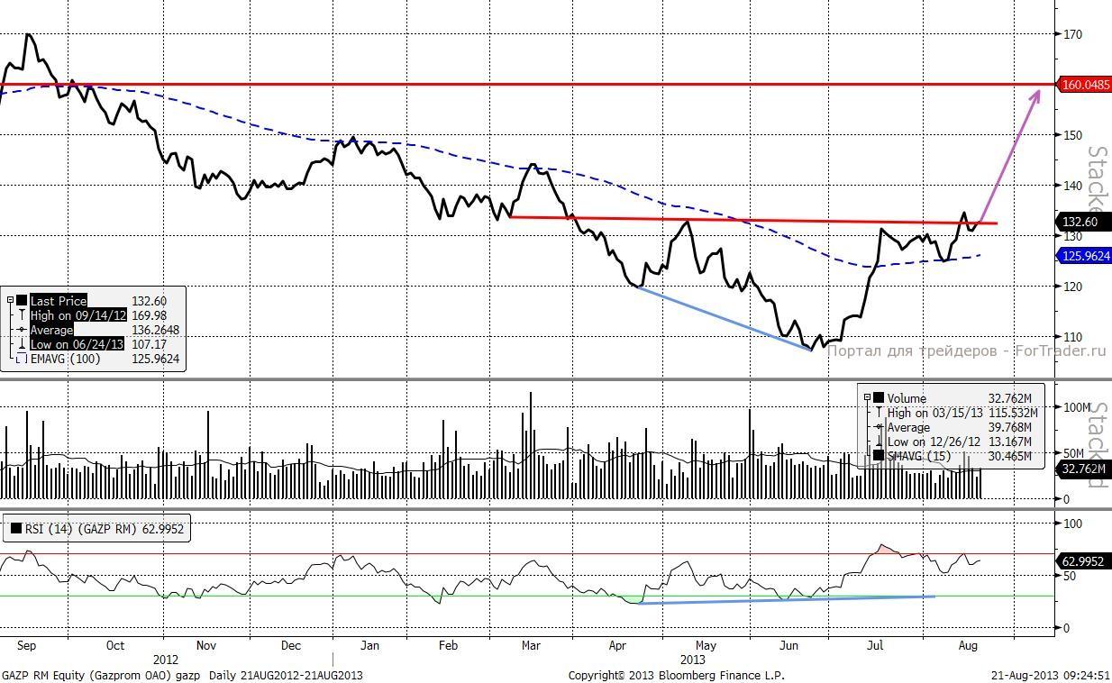 Газпром. После продолжительного снижения на дневном графике начинает формироваться классическая фигура разворота «Голова и плечи». Вместе с тем, цена уверенно закрепилась выше 100 дневной скользящей средней, а предшествовала этой картине конвергенция. В этой ситуации существует большая вероятность роста, как минимум, до 160 руб. за акцию.
