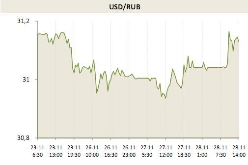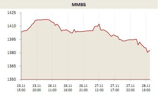 К 14:15 по Москве индекс ММВБ упал на 0,85% до 1382,96 пунктов, индекс РТС при ослаблении рубля потерял 1,16%, составляя на текущий момент 1401,15 пунктов. Лидером падения на московской бирже вновь является «Газпром» (-0,98%), вчера уровень поддержки в 140 рублей за акцию все-таки не стоял под натиском «медведей», и сегодня «газовый гигант» пошел на штурм минимумов с лета 2009 года, которые пока держатся и могут послужить опорой для восстановления. Также дешевеют сейчас бумаги «Сбербанка» (-1,31%), «Роснефти» (-1,05%), «Новатэка» (-1,89%), «Уралкалия» (-1,78%), «Северстали» (-1,88%), «Русгидро» (-1,53%) и «ФСК ЕЭС» (-1,44%). Чуть лучше торгуется в первой половине дня «ЛУКОЙЛ» (-0,73%), порадовавший вчера отчетом за III квартал, очень уверенно выглядят в среду акции «Норильского Никеля» (+0,3%) и «МТС» (+0,11%).