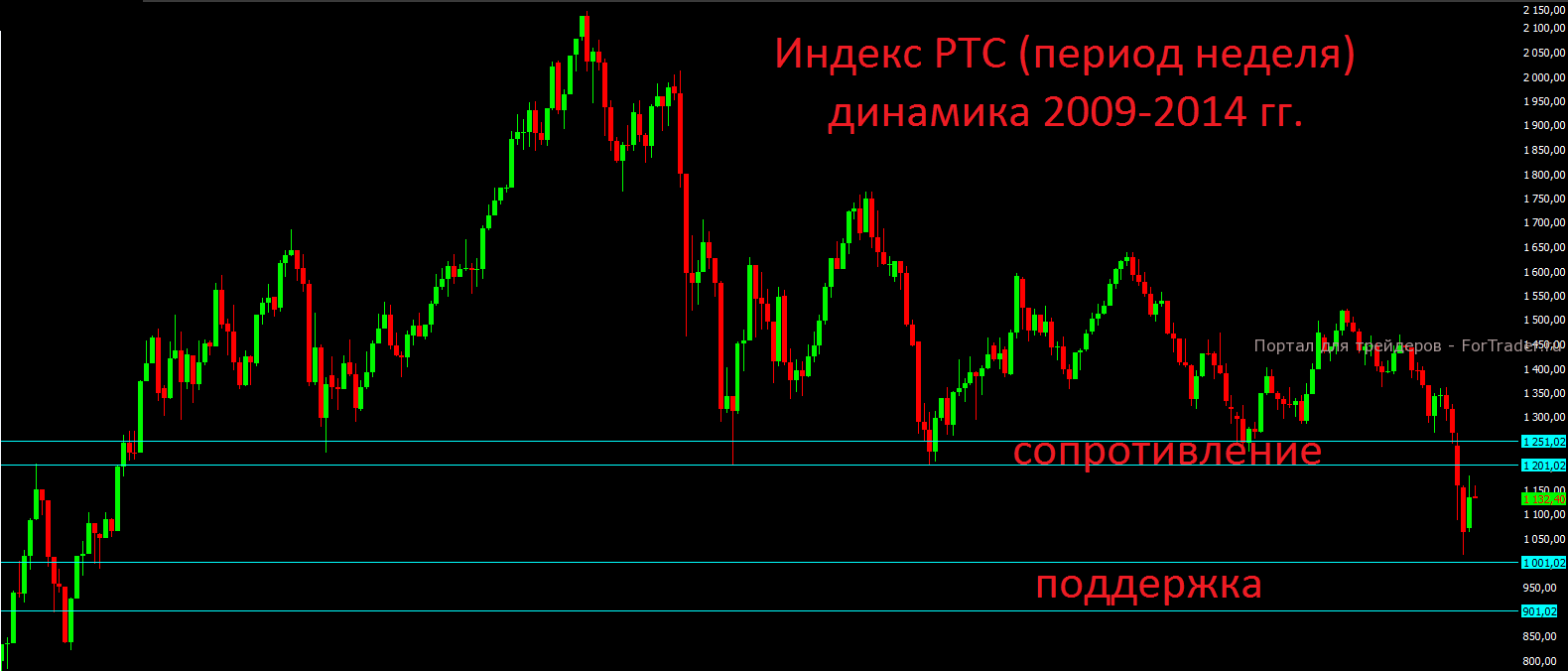 С технической точки зрения российский валютный индекс РТС пока имеет все шансы на отскок до сильного сопротивления на недельном периоде 1200-1250 пунктов, но выход выше этого диапазона до лета мы вряд ли увидим. Пока в голове рисуется следующий сценарий: мы идём немного выше до отметок 1180-1200 и потом будет финальный заход вниз до отметки 900 пунктов.