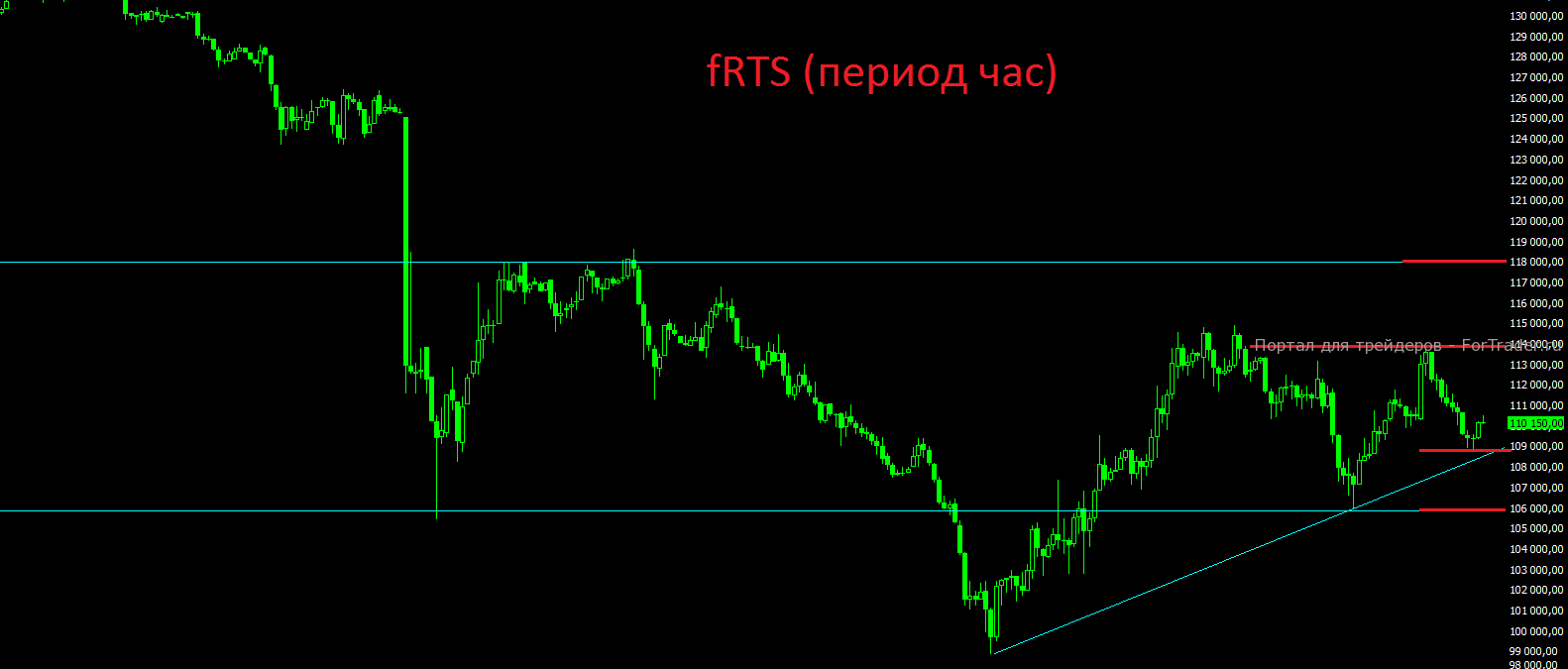 Если посмотреть на более локальную картину по фьючерсу на индекс РТС, то и здесь пока картина весьма чёткая. Цена пытается формировать небольшой восходящий тренд и пока находится в нём. Ближайший уровень поддержки находится на отметке 109000 пунктов, более сильный уровень поддержки находится на отметке 106000 пунктов. В случае закрытия трёх часов подряд ниже отметки 106000 пунктов откроется дорога на новые минимальные отметки года и на поход к отметке 90000 пунктов. Ближайшее сопротивление находится на отметке 114000 пунктов, максимальный рост пока видится до отметки 118000 пунктов. Среднесрочно, пока цена находится выше отметки 106000 пунктов, можно сохранять длинные позиции, открытые ранее.