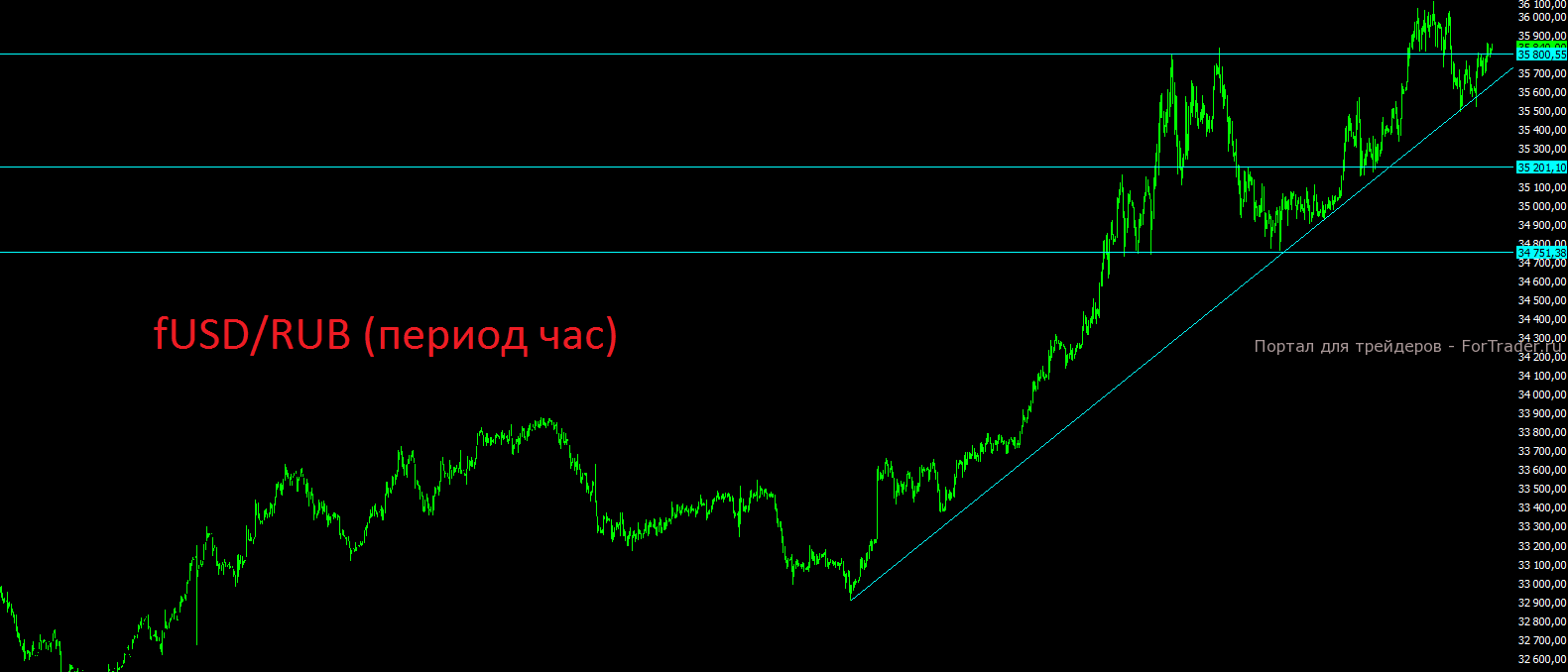 На валютном рынке ситуация за последние сутки не изменилась. Российский рубль пока имеет все шансы на дальнейшее ослабление до отметки 36 в паре с долларом. В марте, возможно мы увидим выход российской валюты к минимумам 2009 года на отметку 36.5. Фьючерс на валютную пару доллар-рубль на часовом периоде чётко продолжает находиться в восходящем тренде.
