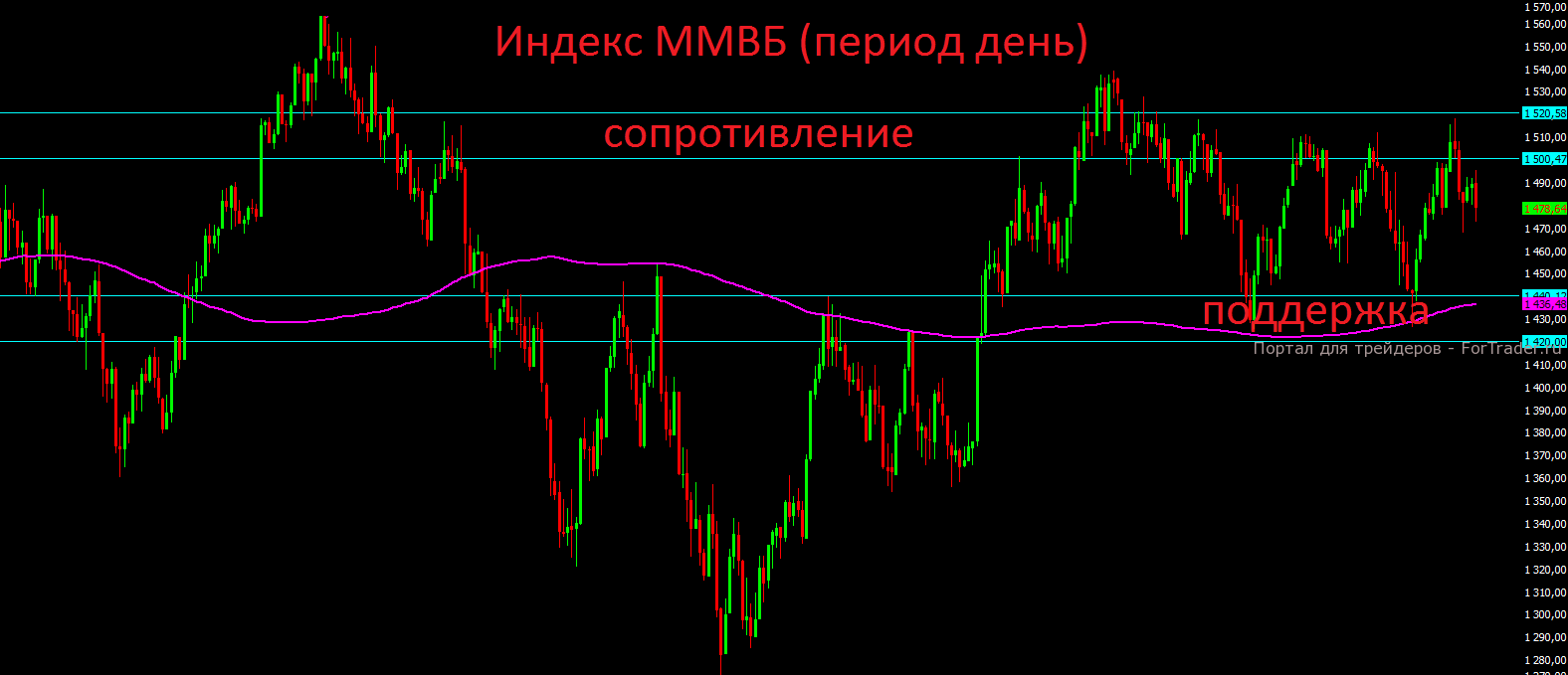 Индекс ММВБ медленно, но верно продолжает сползать вниз от отметки 1500 пунктов. Ближайший уровень поддержки находится в диапазоне 1420-1440 пунктов и пока остаются все шансы на то, что он вновь в ближайшие несколько дней будет протестирован.