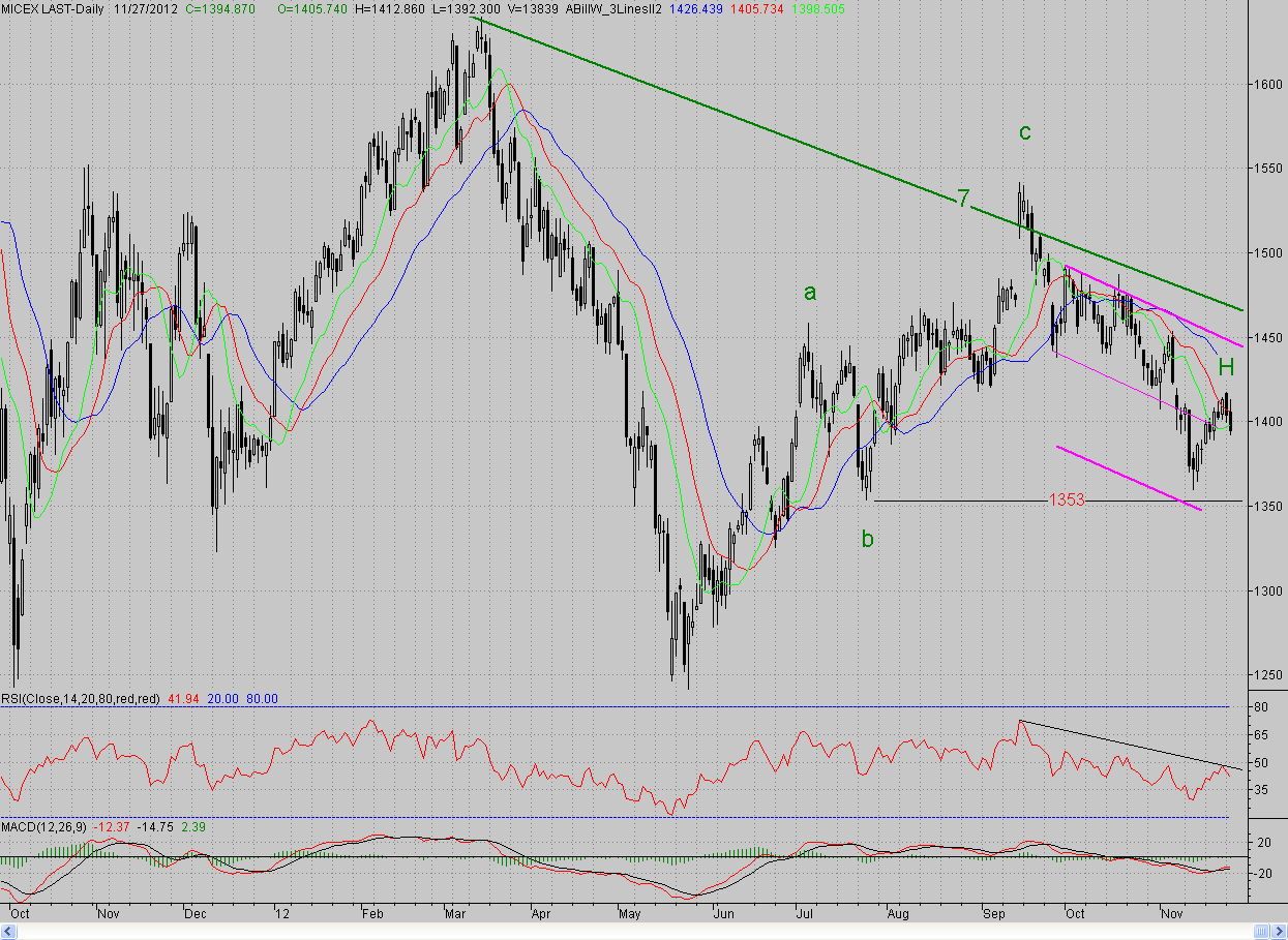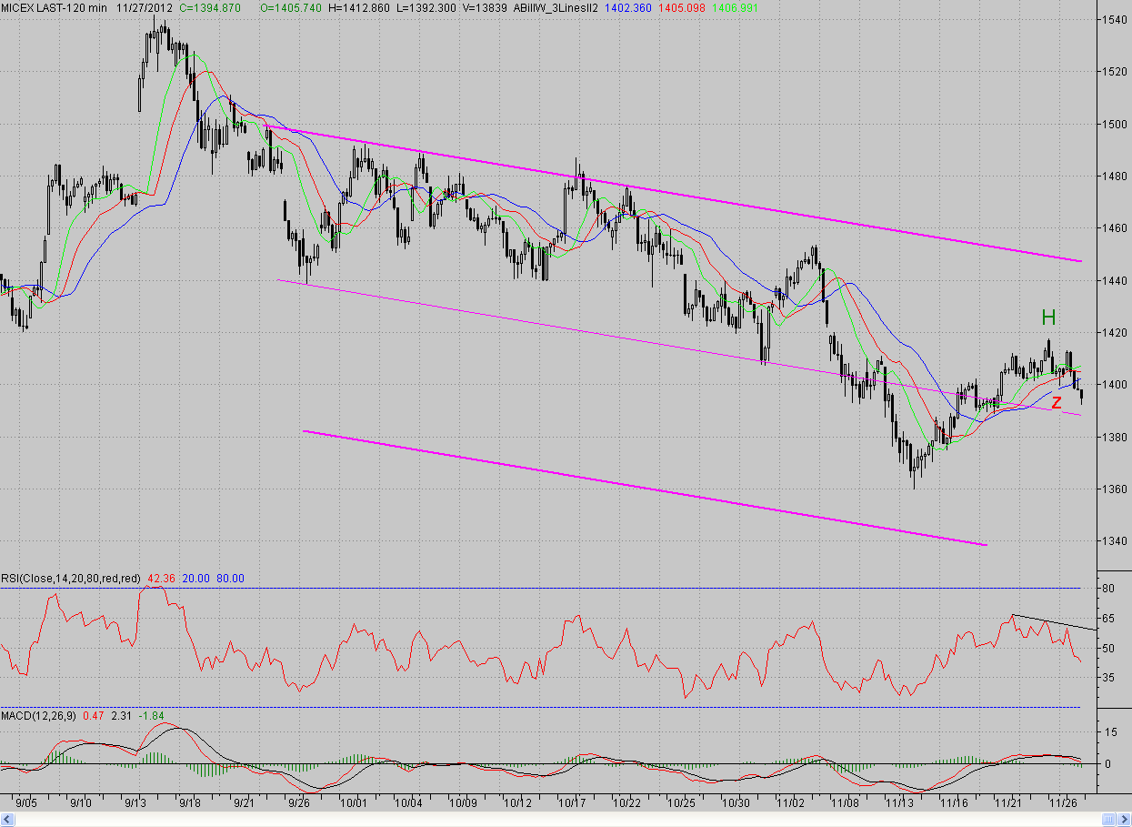 Исследуя 2-часовой график индекса ММВБ, видим, что открывшись с небольшим гэпом вверх, котировки попытались продолжить это движение. Однако оптимизма хватило ненадолго, и цены так и не дошли до максимума предыдущего дня. А с полудня «медведи» возобновили контратаку понедельника и уже до конца дня не выпускали инициативу. В результате цены уверенно преодолели ближайшую поддержку в лице минимума 26.11, который к тому времени стал новым 2-часовым фракталом на продажу Z (1399,6 п.). И только окончание торгов спасло «быков» от дальнейшего отступления, поскольку после нашего закрытия мировые рынки пошли ниже.