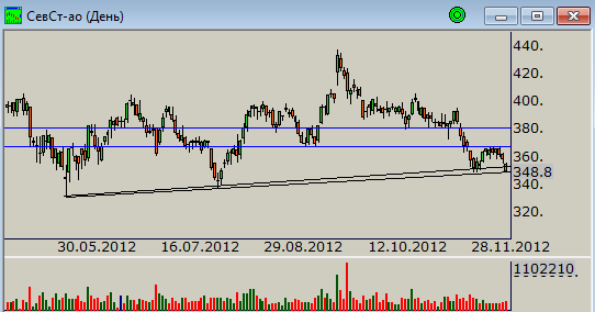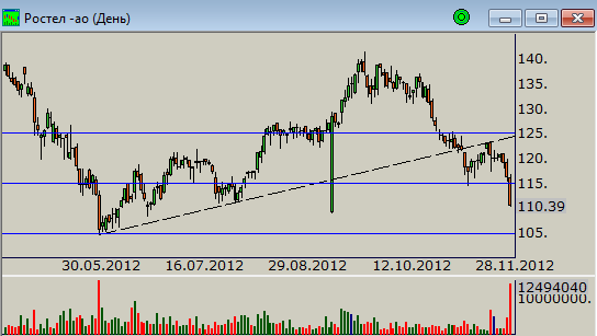Цены пробили отметку 115 рублей, которая ранее сдерживала их движение на юг после пробоя летнего восходящего тренда. Технически есть перспектива тестирования отметки 105 рублей, где покупателям будет оказываться поддержка. А учитывая выход достаточно большого объема вчера, сопоставимый с такой же ситуацией в мае текущего года, можно предположить, что локальное дно снижения рядом.
