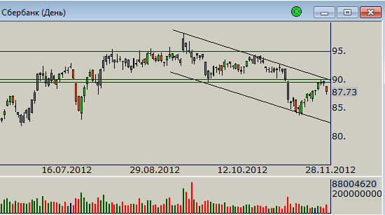 Протестировав верхнюю границу нисходящего канала, усиленную в качестве сопротивления отметкой 90 рублей, цены возобновили снижение. С технической точки зрения напрашивается дальнейшее движение котировок на юг. Однако, учитывая сильное закрытие рынков за океаном накануне, а также позитивный внешний фон утром, покупатели будут способны вернуть утраченные вчера позиции, вернув цены в район отметок 88-89 рублей. Тем не менее, основная тенденция по-прежнему нисходящая. И пока она в силе есть основания рассчитывать на ее развитие.
