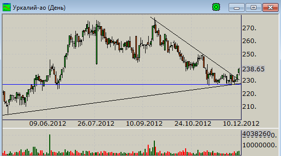 Цены удержали линию спроса годового восходящего тренда, проходящую вблизи отметки 227 рублей. Отсюда покупатели постепенно отодвинули котировки. При этом был пробит осенний нисходящий тренд. Таким образом, есть технические основания рассчитывать на дальнейший рост цен. Ближайшее сопротивление для покупателей сейчас располагается у отметки 250 рублей.