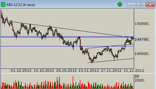 В настоящее время котировки уперлись в локальное сопротивление у отметки 145500 пунктов, образованное диагональным и горизонтальным уровнями. Как видно, покупатели не спешат с их преодолением. Таким образом, данные графические обстоятельства будут способствовать откату цен вниз в рамках диапазона 145500-143500-143000. Диапазон 143500-143000 пунктов сейчас выступает в качестве поддержки. После его возможного тестирования фьючерс вновь будет способен к возможности слома текущих сопротивлений.