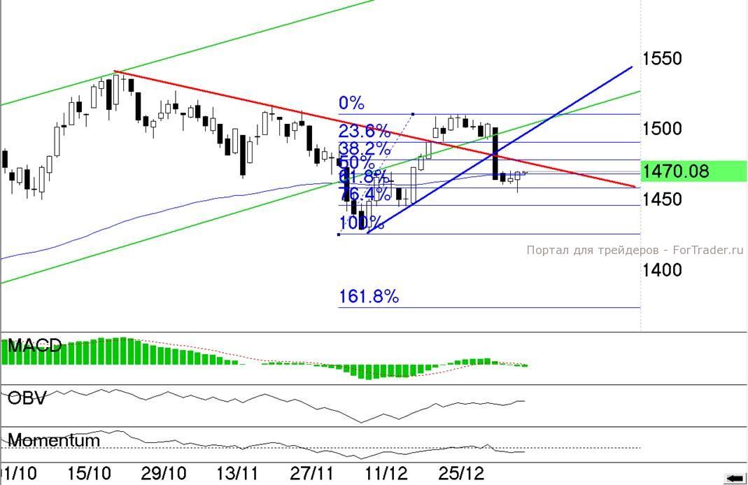За четыре полные торговые сессии нового года индекс покинул свой восходящий тренд декабря 2013, и естественно ничего вразумительного нарисовать не успел. Единственное, что нас здесь может сориентировать – растяжка Фибоначчи. Она нарисована к такому маленькому тренду, что доверять ей на сто процентов нельзя! Её вполне допустимо так рисовать, но обычно, помимо такой мелкой растяжки, на графике есть более крупная к глобальному движению. Обычно… Но не сейчас на ММВБ!
