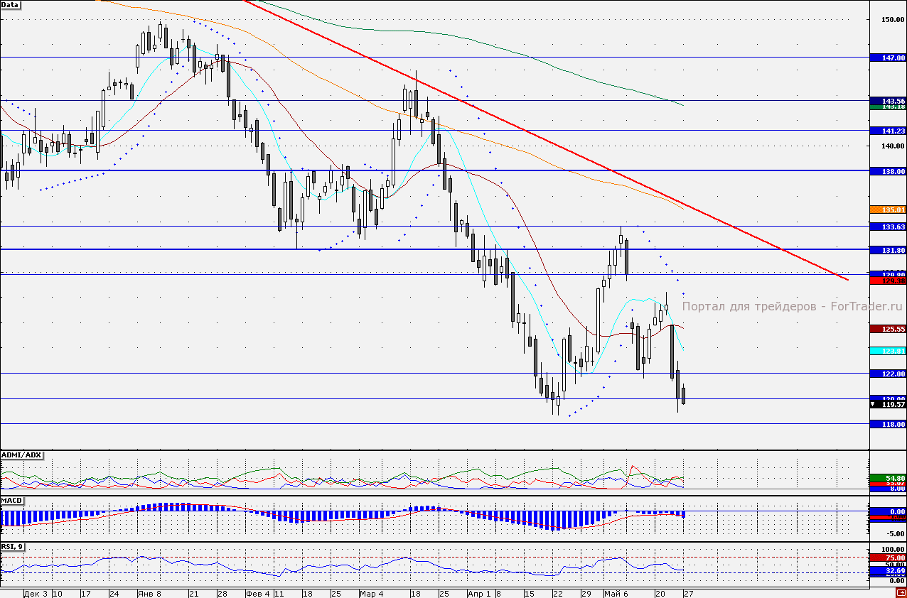В очередной раз слабее рынка смотрятся акции «Газпрома». В пятницу бумаги уходили ниже 120 руб., но завершили торговую сессию выше данной отметки. Уже сегодня «медведи» вновь проявили силу. Пока негативная тенденция на графике акций преобладает, о чем могут свидетельствовать показания трендовых индикаторов. Индикатор ADMI/ADX показывает, что преимущество находится на стороне продавцов (линия «медведей» находится выше линии «быков»), при этом гистограмма MACD (12;26;9) растет на отрицательной территории. Так при сохранении негативных настроений целью для акций выступает возвращение к годовому минимуму 118,64 руб. Наш 30-минутный торговый робот пока находится в «шортах», удерживая позиции от отметки 124,28 руб. Таким образом, короткие позиции по бумагам пока более привлекательны. Инвесторы более склонные к риску могут продолжать удерживать короткие позиции по бумагам с целью снижения в район годового минимума 118,64 руб., при достижении которого «шорты» стоит закрывать.