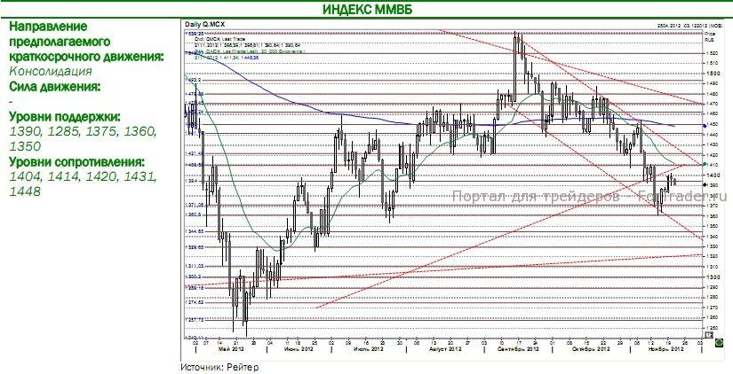 Ввиду отсутствия новостных драйверов из Европы и США, а также в преддверии закрытия рынка США завтра из-за празднования Дня Благодарения, российский рынок, скорее всего, откроется с небольшим снижением с новой попыткой теста 1380-1390  пунктов  по ММВБ,  продолжая,  однако консолидацию под уровнем 1400 пунктов в ожидании новых сигналов от мировых рынков.