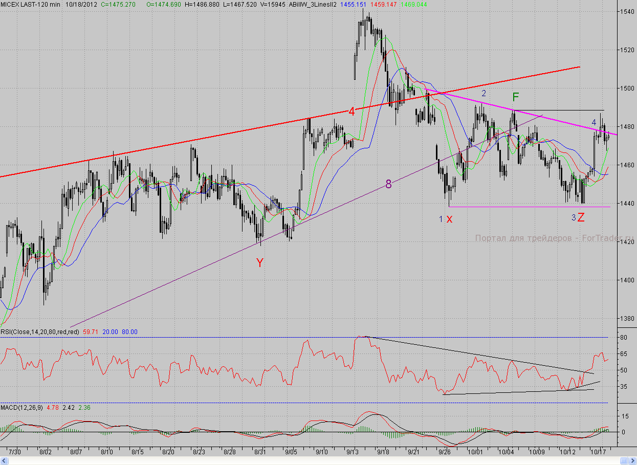 Исследуя 2-часовой график индекса ММВБ, видим, что открывшись практически на тех же уровнях, котировки продолжили восхождение, начатое днём ранее. Интересно, что внешний фон при этом был более чем спокоен, так что рост происходил на внутренних драйверах и, скорее всего, по инерции от позитива среды. В первые минуты ценам удалось преодолеть ближайшее сопротивление в лице верхней грани «треугольника» и добраться до ключевого рубежа медвежьей обороны – дневного фрактала на покупку F (1488,55 п.). Кстати, в данном районе проходит и долгосрочный падающий тренд (7), берущий своё начало с апреля 2011 года (см. дневной график). От этого района «мишки» начали довольно активную контратаку и в итоге скинули цены с верхней грани «треугольника». Однако «быки» отступали стройными рядами и в целом сумели удержаться в районе этой грани, таким образом, закрыв день в «нуле».