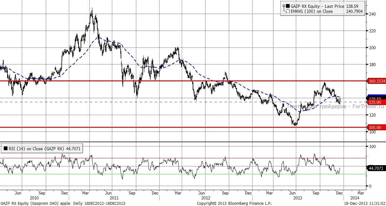 Акции Газпрома проседают внутри дня после достижения ряда соглашений в отношении Украины и ее достаточно либеральной цены на «голубое топливо». Планы по сокращению инвестпрограммы Газпрома на 2014 и 2015 годы так же не способствуют оптимизму. Однако не все так однозначно. Открытие сегодняшней торговой сессии было охарактеризовано ценовым разрывом вверх, который был быстро «закрыт». Технический анализ сейчас не дает четких сигналов к совершению сделок. На сегодняшний день, наиболее актуальный сценарий — это колебание в рамках диапазона цены 135-160 руб. за акцию. Рынок сейчас находится в ожидании более важных решений по монетарной политике из-за рубежа, в первую очередь из США.