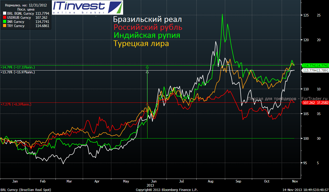 За прошедшую неделю с развивающихся рынков было выведено более $2,5 млрд. Отток капитала продолжает негативно влиять на валюты всех развивающихся стран, которые за прошедшую неделю испытали весьма существенное падение и российский рубль, тоже не смог остаться в стороне. Стоит отметить, что российская валюта на протяжении всего 2013 года вела себя намного стабильней и даже в этом году смотрится чуть лучше среди всех валют развивающихся стран.