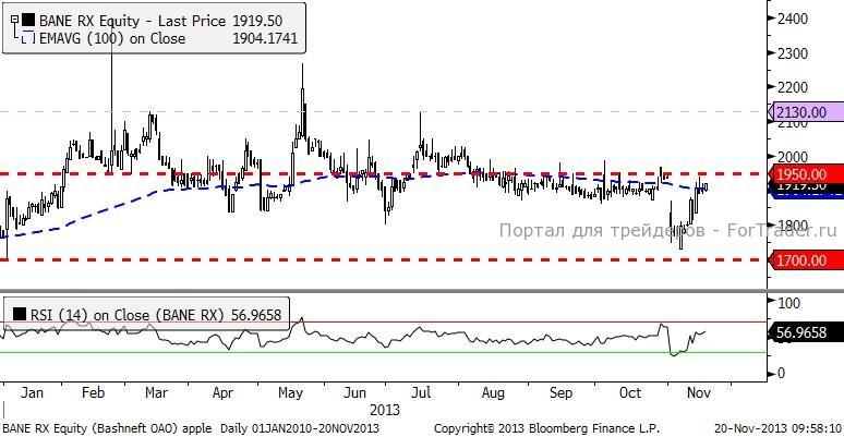 После объявления о подготовке проведения SPO в Лондоне акции Башнефть подрастают. Технический анализ указывает на то, что лучшей точкой для покупки был уровень 1700 руб. за акцию. Теперь дополнить портфель акциями имеет смысл лишь при преодолении уровня 1950 руб. Согласно трендовому движению потенциал акций остается весьма приличным. На наш взгляд, 2400 руб. это реальный сценарий в ближайший год-полтора.