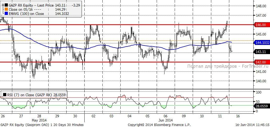 Перевод Нафтогаза на предоплату негативно сказался на котировках Газпром. К полудню акции теряют около 2%. С технической точки зрения существует потенциал падения к ближайшей цене поддержки – 142 рубля. С учетом важности политических решений стоит внимательно следить за краткосрочным каналом 142–146 руб. Пробитие одного из этих уровней определит направление на ближайший месяц.