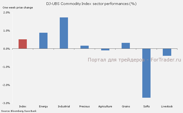 Сырьевой индекс DJ-UBS, похоже, начинает формировать дно после трех недель продаж, вызванных желанием инвесторов на сельскохозяйственном рынке зафиксировать прибыль. Прошедшую неделю сектор снова завершил в минусе, в частности под воздействием коррекции на рынке выращиваемых товаров и падения на рынках кукурузы и пшеницы.
