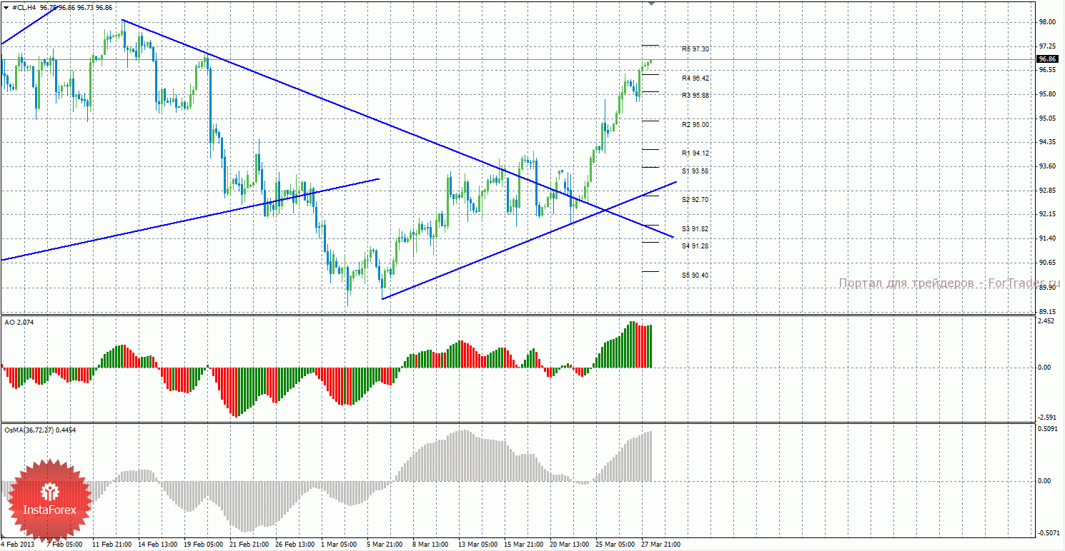 Анализ сырой нефти за 28 марта показывает, что цена продолжает восходящее движение и закрепилась выше уровня сопротивления R4 – 96,42, оба индикатора по-прежнему направлены наверх. Восходящая линия тренда продолжает поддерживать торгующих на повышение. Поэтому на данный момент актуальны длинные позиции с целью R5 – 97,30. Также может начаться нисходящее коррекционное движение с целями 95,88 и 95,00, если цена закрепится ниже уровня R4 – 96,42. Индикатор Awesome показывает текущее восходящее движение, так как последний закрытый бар зеленого цвета, что говорит в пользу возможного продолжения восходящего тренда. OsMA также направлен наверх, что говорит о восходящем характере движения и в более долгосрочном плане. Если цена закрепится ниже уровня 96,42, это может спровоцировать начало нисходящего коррекционного движения.