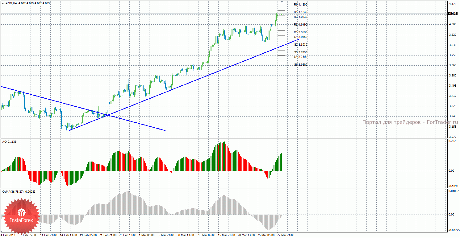 Анализ природного газа за 28 марта показывает, что цена продолжала вчера восходящее движение и закрепилась выше уровня сопротивления R3 – 4,0830, оба индикатора направлены наверх. Сейчас актуально восходящее движение с целями 4,1230 и 4,1860. Целями для возможной нисходящей коррекции выступают уровни 4,0190 и 3,9560, если цена закрепится ниже уровня 4,0830. Восходящая линия тренда оказывает поддержку быкам и не дает цене пока что уйти ниже себя. Индикатор Awesome показывает локальное восходящее движение, последний закрытый бар окрашен в зеленый цвет, что говорит в пользу продолжения восходящего движения. OsMA также направлен наверх, что сигнализирует о восходящем движении цены на газ и в более долгосрочной перспективе. Если цена закрепится ниже восходящей линии тренда, то на рынке произойдет смена тенденции на нисходящую, но пока что цене это не грозит. В случае закрепления цены ниже уровня 4,0830, может начаться нисходящая коррекция.