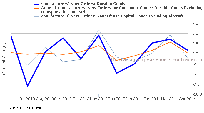 Однако рост заказов в апреле был во многом обусловлен ростом заказов на военную технику, заказы взлетели на 39,3%. Заказы без учета товаров оборонного назначения упали на 0,8%. Заказы без учета транспортного оборудования выросли на 0,1% м/м, тогда как изменений не ожидалось. Ключевой индикатор будущих инвестиций бизнеса — заказы на капитальные товары необоронного назначения без учета воздушных судов (Nondefense Capital Goods Orders Ex Aircraft) упал в апреле на 1,2% м/м, после роста на 4,7% в марте.