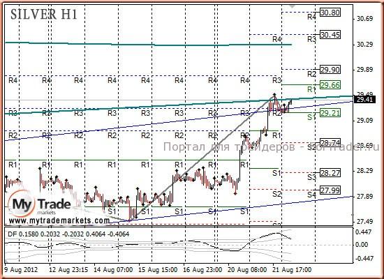 В итоге золото вышло из сформировавшегося треугольника вверх и сформировало тем самым повышающуюся структуру. Я не вошел по 1590,00, а ждал, что будет еще рывок вниз к 1585,00, поэтому остаюсь в стороне. Серебро также формирует повышающуюся формацию.