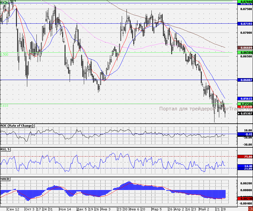 В ходе вчерашней сессии акции эмитента переписали локальный минимум, опустившись в район 5,2 коп. При ухудшении настроений данный уровень может быть вновь протестирован. В качестве актуального сопротивления остается 10-дневная скользящая средняя, в районе которого я рекомендую хотя бы частично фиксировать прибыль по лонгам. Закрепление выше данной отметки откроет дорогу на 5,5 коп.