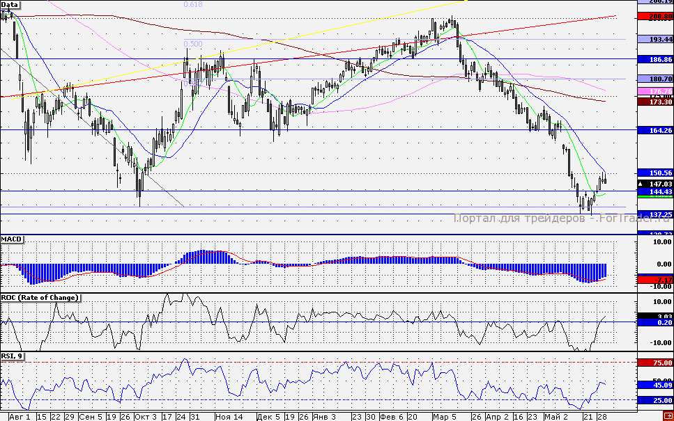 Значимый рубеж 150 руб. вновь остался непоколебимым по итогам вчерашней сессии. При улучшении настроений данный уровень может вновь выступить целью по бумагам. В этом случае я рекомендую фиксировать прибыль по лонгам в районе данной отметки. Ближайшей значимой поддержкой по акциям «Газпрома» является уровень 145 руб., при достижении которого агрессивные инвесторы могут рискнуть открыть спекулятивный лонг. Однако потенциальные убытки стоит все же ограничить защитными стоп-приказами.