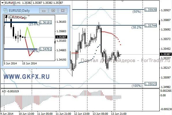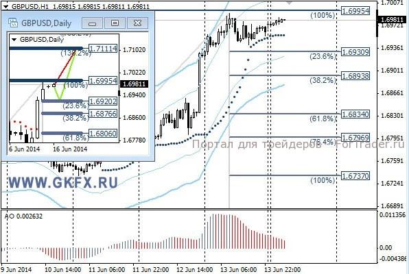Пара EURUSD росла первую половину дня, как и предполагалось, но движение относилось к коррекционной волне, поэтому цена продвинулась недалеко, даже до отметки 1,3600 не дотянула. Во второй половине дня прошло резкое движение вниз, но оно оставалось в пределах четверга. На дневном графике очевиден слом восходящего движения, которое тянется с лета 2012 года. Контрольной точкой станет отметка 1,3475. На эту неделю традиционно рассматриваю два варианта возможного движения цены, основной красный и альтернативный зеленый. Значимые уровни на сегодня отмечены на часовом графике. Индикатор АО находится в отрицательной зоне и растет, указывая на коррекцию перед возможным продолжением снижения. Индикатор тренда указывает на снижение. Наблюдаем за желанием рынка.