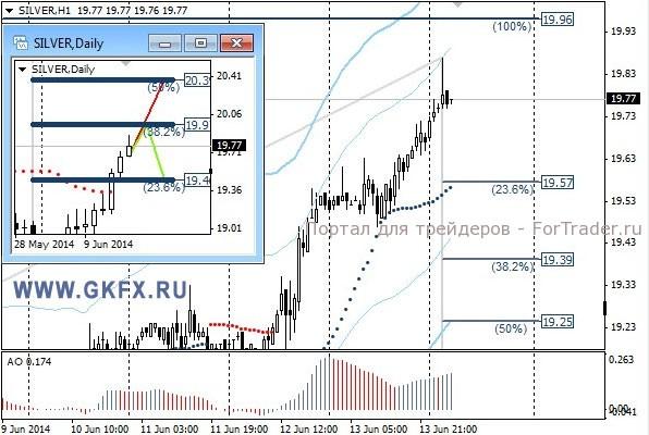 Цены на серебро совершали рост на американских торгах после слабой статистики по США. В отличии от золота двигались более уверенно в рост. Ожидаю на этой неделе продолжения роста. Прошедшая неделя отработалась по красному варианту движения цены. Традиционно делаю два варианта движения цены на неделю, основной красный и альтернативный зеленый. Значимые уровни на сегодня отмечены на часовом графике. Индикатор АО находится в положительной зоне и растет, указывая на желание инструмента двигаться вверх в данное время. Индикатор тренда указывает на рост. Наблюдаем за желанием рынка.