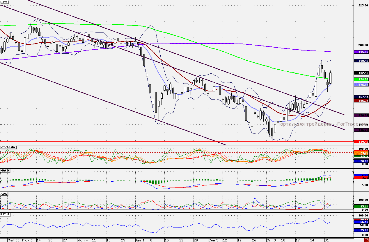 Акции компании вчера оттолкнулись вверх от 10-дневной скользящей средней – 175 руб. Внешний фон располагает к очередному тестированию данного уровня. Акции компании выглядят одним из наиболее интересных инструментов для переноса «лонгов» на следующую неделю, поскольку отчетность пока так и не оглашена и ожидание финрезультатов поддерживает котировки.