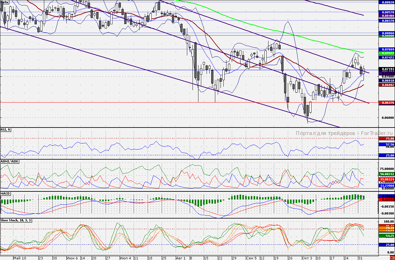 Акции ВТБ могут вновь опуститься в район поддержки 6,900 коп. Поддержкой является 6,800 коп., где проходит 21-дневная скользящая средняя, от данной отметки длинные позиции стоит наращивать. Сопротивлением является 7,200 коп.