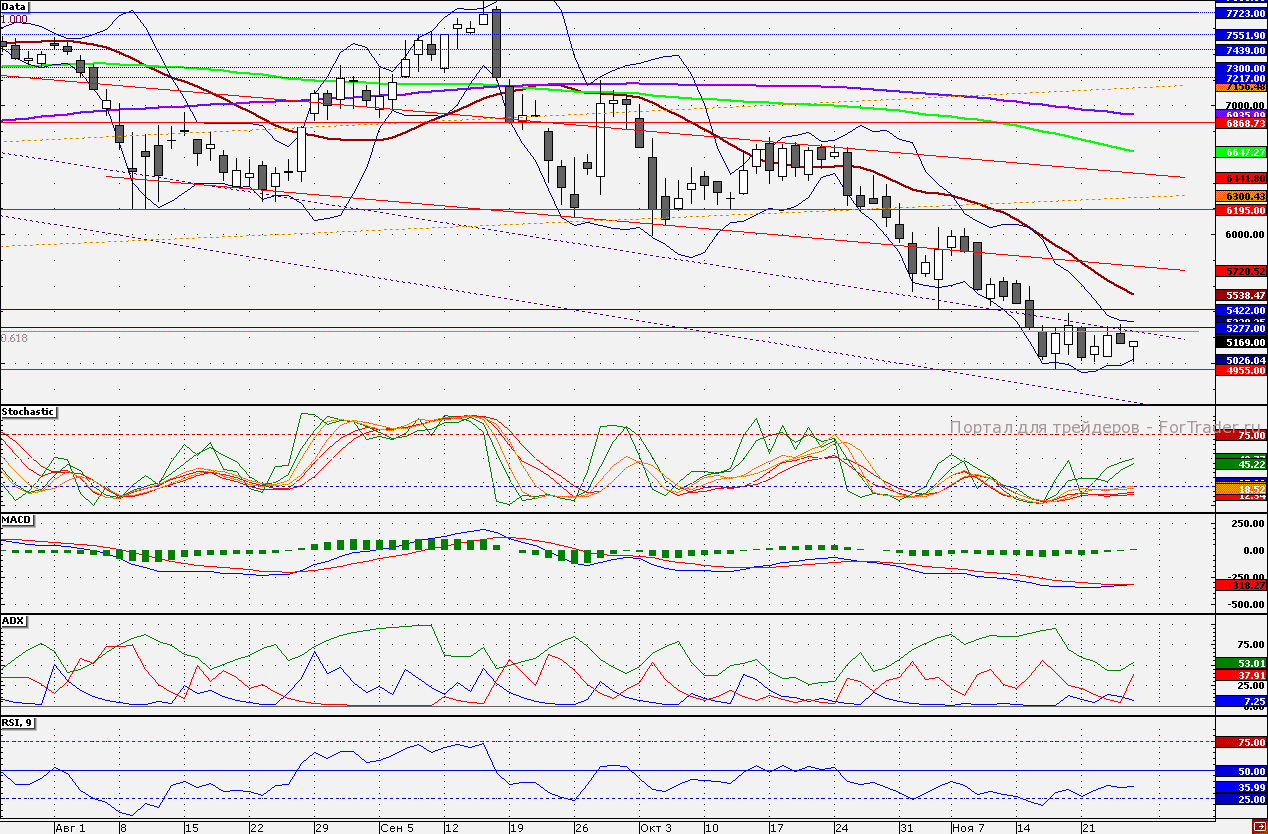 По акциям ГМК «Норникель» сохраняется боковой тренд, сформированный в середине ноября. Поддержкой по бумагам является круглая отметка 5000 руб., а сопротивлением 5300 руб. От данных уровней стоит совершать торговые операции внутри дня. Пробитие данных отметок приведет к формированию нового тренда.